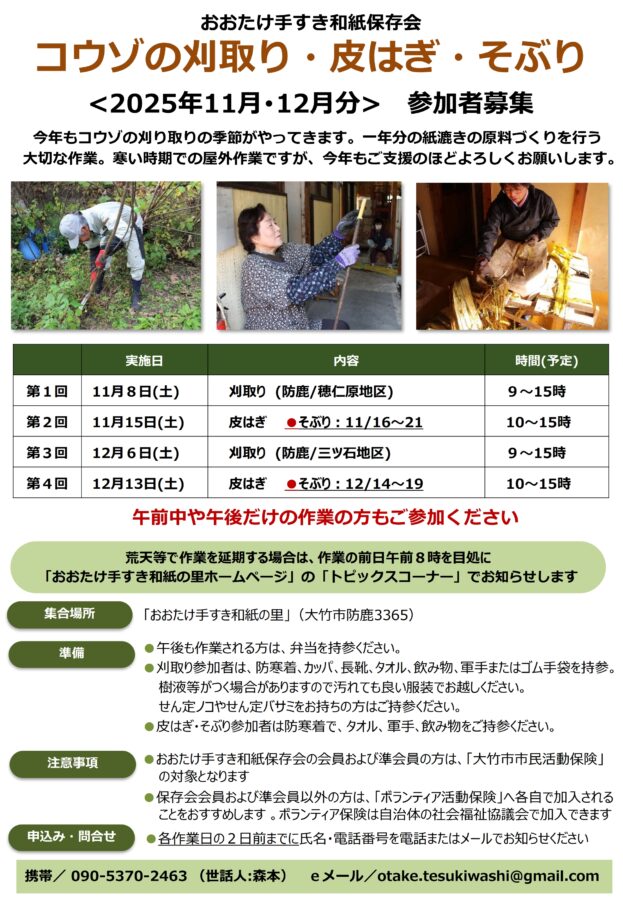 春に芽吹いたコウゾも晩秋の訪れとともに刈取りの季節を迎えます。おおたけ手すき和紙保存会では、一年分の紙漉きの原料づくりを行う、刈取り~皮はぎ~そぶりの作業を来年3月まで全9回予定しています。今回はそのうち11月・12月分の作業日程をお知らせします。寒い時期での屋外作業ですが今シーズンもご支援のほど、どうぞよろしくお願いいたします。