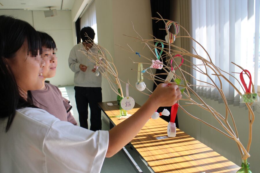おおたけ手すき和紙保存会では、毎年、大竹市立図書館主催の和紙を使ったワークショップのお手伝いをしています。今年は、コウゾと同じように和紙の原料となる「ミツマタ」の木がら(皮をはいだもの)を使ってクリスマスツリーを作りました。「ミツマタ」の名前の由来は、枝が三本に分かれて出ることからきています。枝に、和紙で作ったいろんなオーナメントをぶら下げると、きっと楽しいだろうな・・と保存会会員の一人が企画し準備しました。11月22日(土)に行ったワークショップの参加者は、計8組。その中には、大人に交じって小学生の姉妹がいました。薄めの和紙や厚手の和紙、色紙や皮をすきこんだものなど、いろいろな種類の和紙に触れながら、楽しみながら素敵なクリスマスツリーが完成しました。出来上がったオーナメントを枝に飾るときは、とてもうれしそうでしたよ。